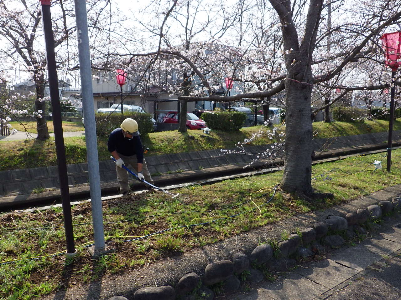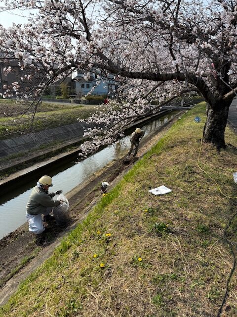 今年もボンボリ付け、照明設備の設置を地域の方々と協力し設置完了したので、川沿いの清掃活動を行いました。